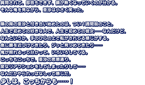 ただ、結構負けず嫌いな面があり、照れさせられるばかりの亜沙との関係に悔しさを感じ、自分も亜沙を恥じらわせてやるんだ、と奮起することになる。