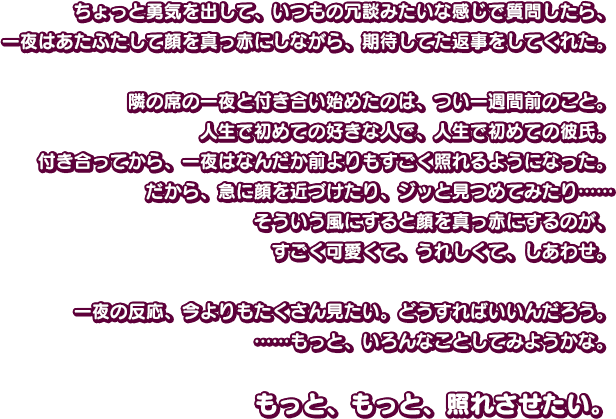 しかし一夜には決して見せないが、実は家では一人、一夜の反応を思い出してだらしなく悦に浸っていたり、大胆に迫ったことに恥じらい、悶えたりしている。